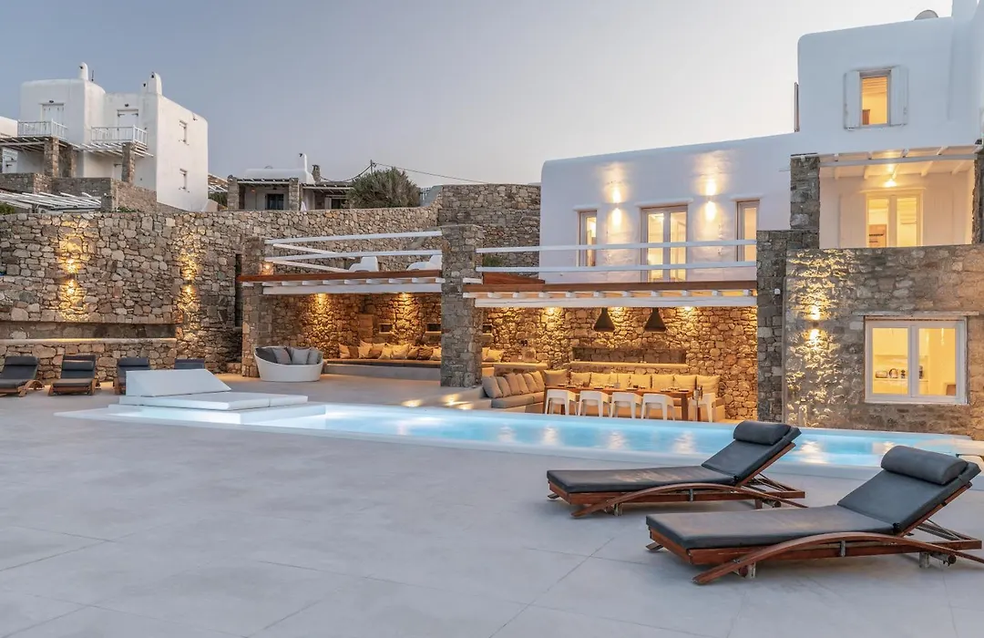 Perfect for a relaxing stay, Mykonos Actor'S Villa. 3 Bedrooms, Private Pool. apartment offers a patio, a balcony and a seating area with a stone fireplace, and convenient amenities such as air conditioning. The accommodation is also furnished with a sofa. The property boasts 4 bedrooms along with non-allergenic pillows. Visitors will enjoy the comfort of a bathroom with a hair dryer, dressing gowns and slippers in this apartment.